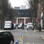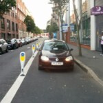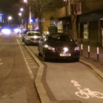 # Four parking cars, three white vans, two loading trucks, and a Peugeot in the bike lane #