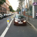 # Four parking cars, three white vans, two loading trucks, and a Peugeot in the bike lane #