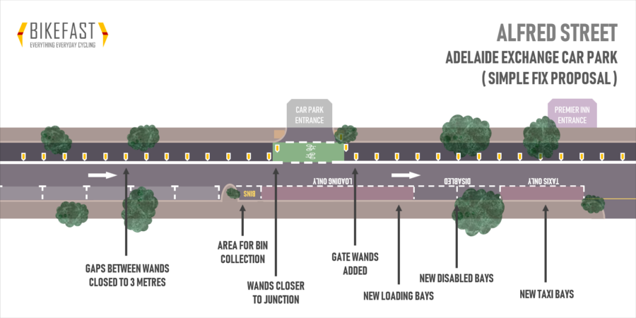 Taking the main areas of concern identified in the first article, let’s apply these three solutions and look at other simple measures which will improve Alfred Street’s current set-up: