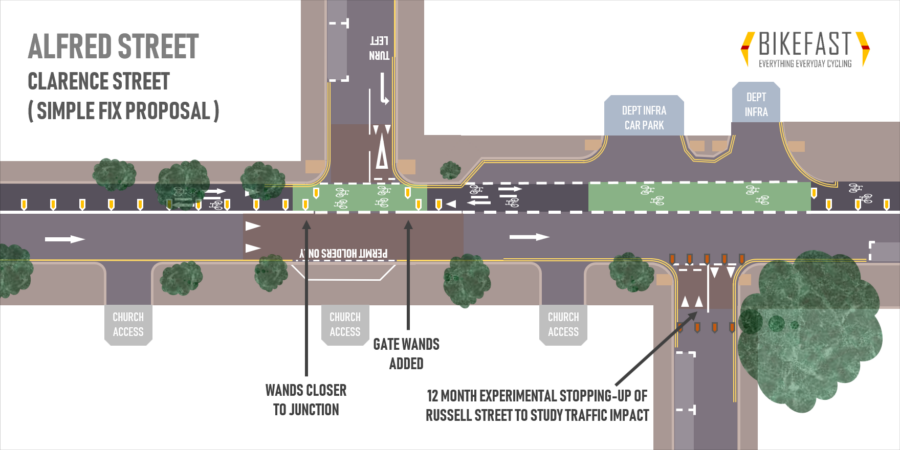 In the second of four articles exploring the Department for Infrastructure’s (DfI) review of the Alfred Street cycleway, Bikefast looks at implementing the glaringly obvious, slap-you-in-the-face, bare minimum solutions – the ones which DfI should have already rolled out to keep users safe and stem the tide of criticism of this worthwhile project.