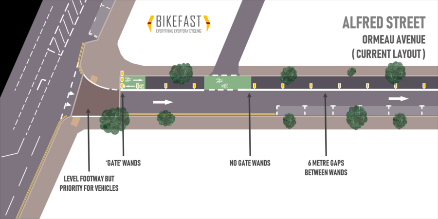 The review itself is now open to the public for comment on the operation and maintenance of the Alfred Street cycleway and its related schemes – you can find the link at the bottom of the article. Bikefast has two solutions; an easy fix or radical change. We’ll explore the latter in the final article, but if DfI are determined to keep the cycleway in place and tinker around the edges, here is what they need to do.