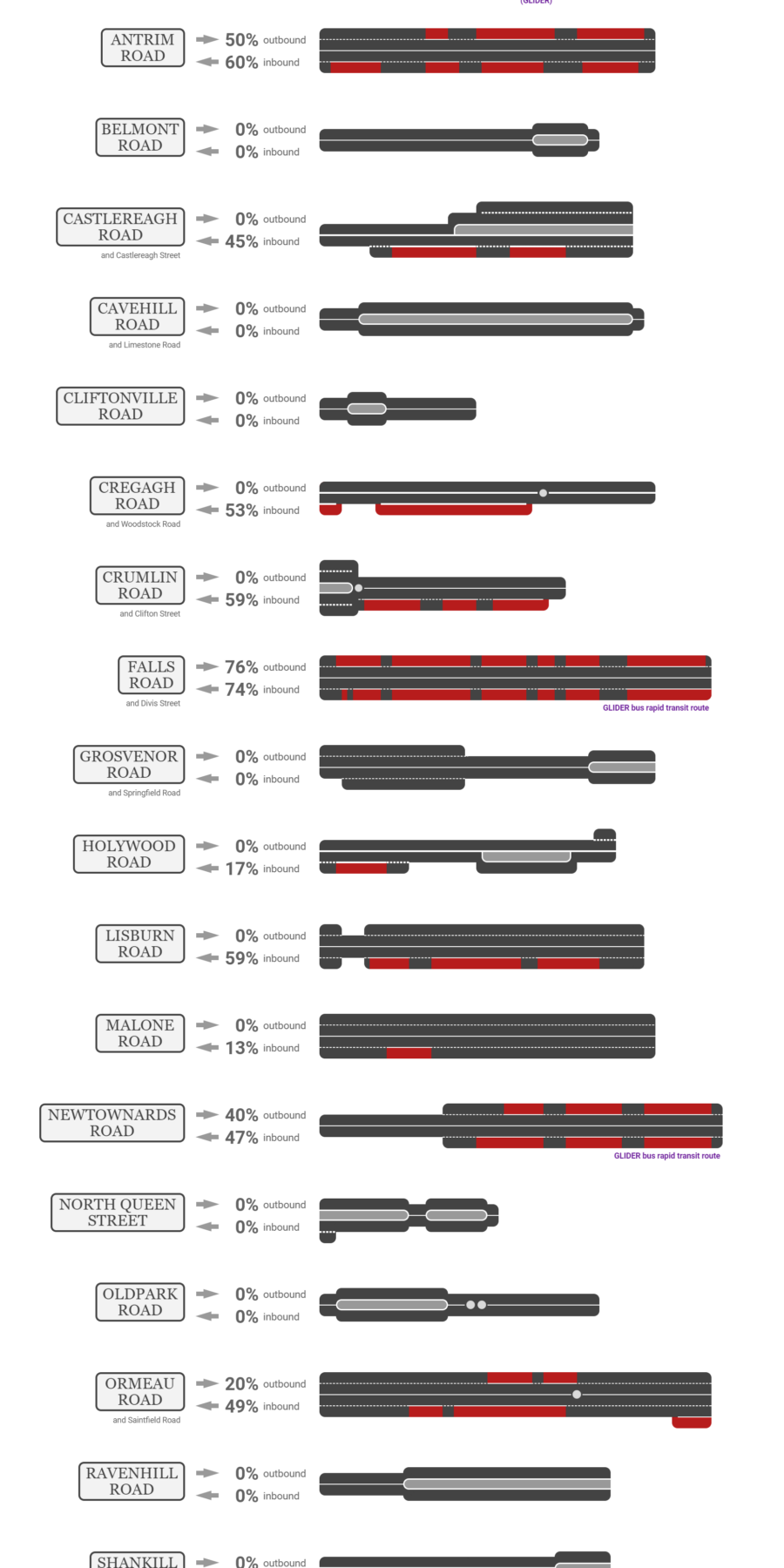 The roads with the greatest proportion of bus lanes are naturally the Glider Bus Rapid Transit corridors, but overall the city is lacking in really game-changing bus priority at the expense of general traffic space. Drivers might claim to have half the road space taken away from them, but 85% of the time around Belfast that’s nonsense.