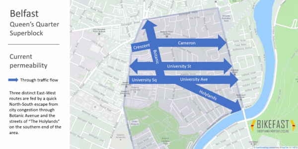 The easy permeability is one of the main issues. Three distinct East-West routes are fed by a quick North-South escape from city congestion through Botanic Avenue and the streets of “The Holylands” on the southern end of the area.