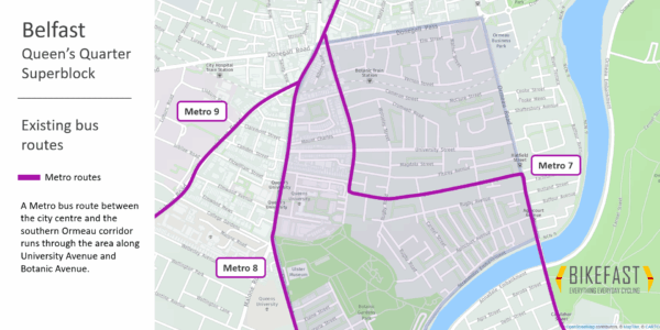 A Metro bus route between the city centre and the southern Ormeau corridor runs through the area along University Avenue and Botanic Avenue. The southern extension of the “Glider” bus rapid transit system is due to run along the length of the Ormeau Road in a few years.