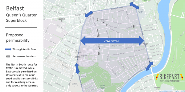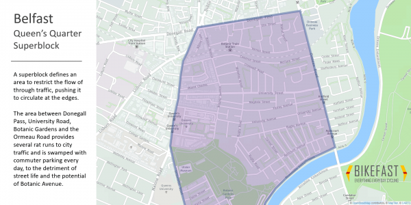 The term has been used to describe work to reduce traffic levels within areas of Barcelona, and Bikefast has proposed a superblock-style approach to re-configuring Belfast’s Linen Quarter.