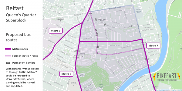 With Botanic Avenue closed to through-traffic, Metro 7 could be rerouted along University Street, where parking would be halved and regulated.