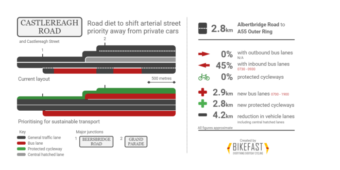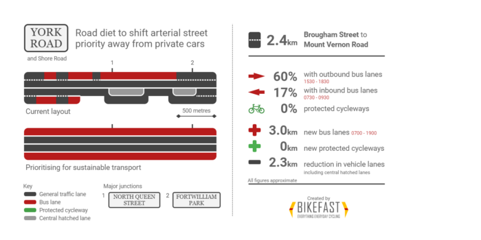 Let’s take two detailed examples of how a road diet would work – Castlereagh Road in East Belfast (pictured at the top of the article) and York Road in North Belfast.
