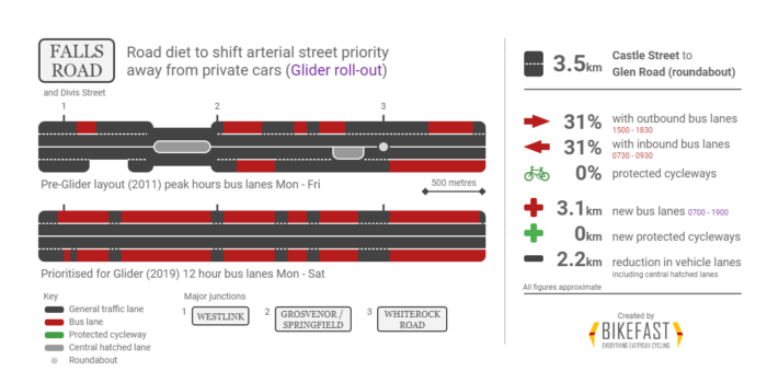 This form of road diet is now live on two of Belfast’s arterials, with 12 hour Glider bus lanes also constricting vehicle flow along most of the Newtownards Road.