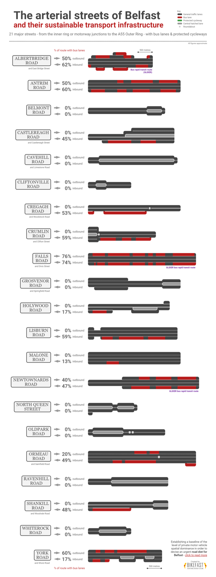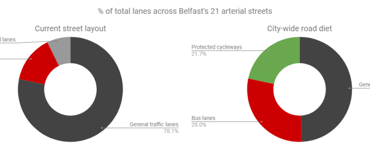 The starting point is to recognise that Belfast is such a small city that any major arterial street with more than a single vehicle lane in each direction is an extravagance that encourages people to actively choose to drive.