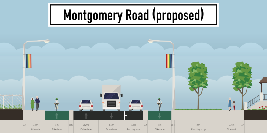 - creating protected with-flow cycleways on both side of Montgomery Road