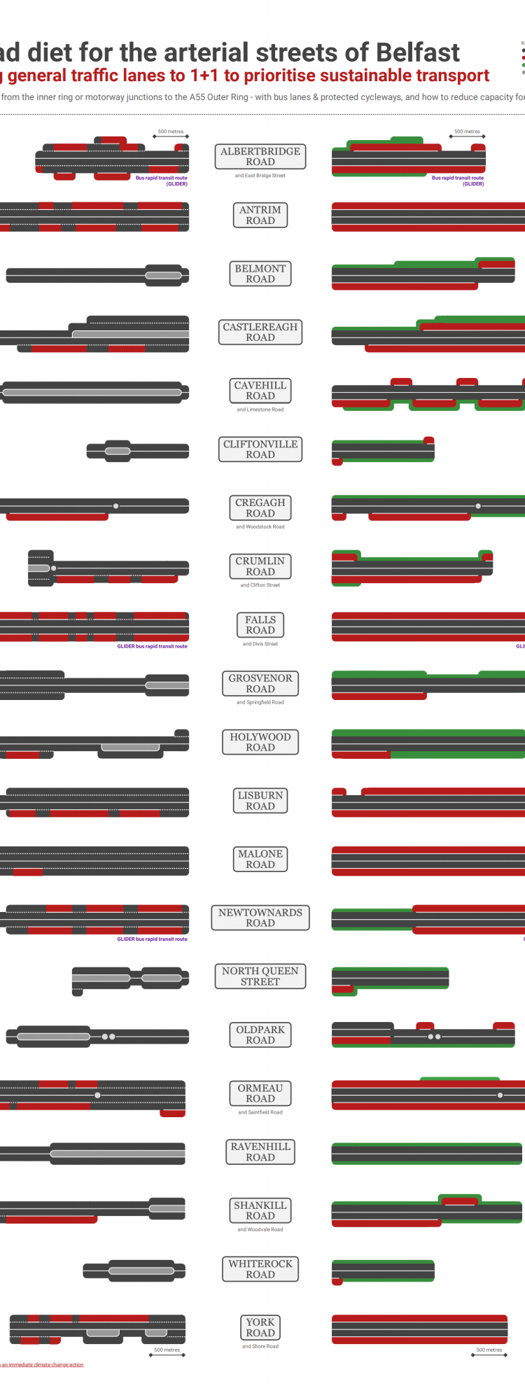 The starting point is to recognise that Belfast is such a small city that any major arterial street with more than a single vehicle lane in each direction is an extravagance that encourages people to actively choose to drive.